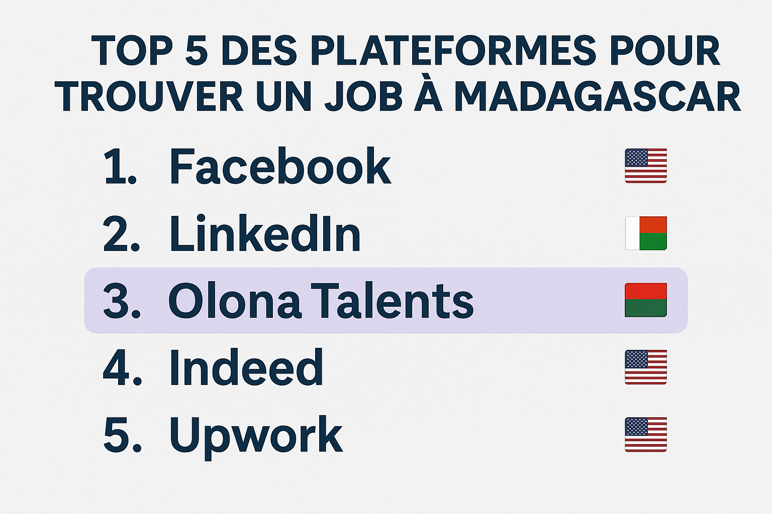 Trouver un emploi à Madagascar peut être un défi, surtout quand on cherche à explorer toutes les opportunités disponibles sur le marché. Voici les cinq principales plateformes où vous pouvez décrocher un job à Madagascar, adaptées aux talents locaux et internationaux. Parmi elles, Olona Talents se démarque particulièrement grâce à son service unique et 100% malgache.